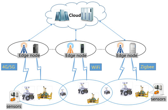 The mechanical equipment in the mine environment is divided into fixed equipment and mobile equipment [9]. Fixed equipment primarily includes large, immovable devices such as conveyors, stationary crushers, and vibrating screens. The operational states of these devices are complex and variable, requiring the deployment of various sensors to collect multi-faceted data. This imposes periodic computational loads on the processing nodes. Additionally, structural and layout differences among devices necessitate different sensor types to meet specific requirements. The available locations for edge node deployment also vary, and the flexibility of deployment schemes remains limited. Mobile equipment primarily comprises devices that necessitate mobility during mining operations. This category includes unmanned excavators for material extraction and transport vehicles involved in logistics. These machines typically follow fixed trajectories between material sites and handling equipment, with tasks often adhering to cyclical patterns. Prompt processing of task requests from mobile devices is crucial to maintaining the safety and efficiency of the overall operation.