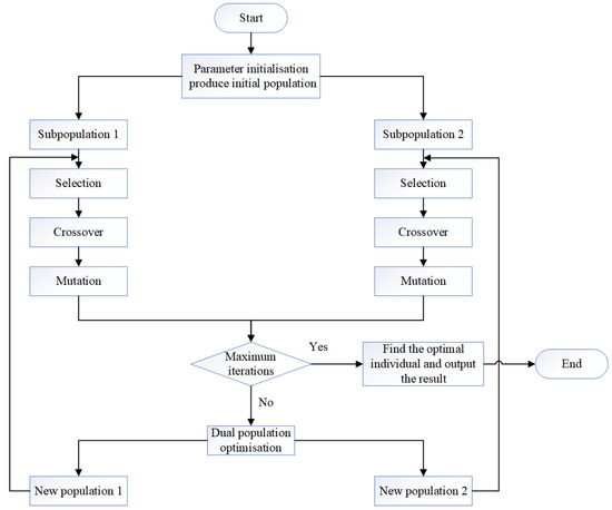 Deploying edge nodes in a fixed scenario constitutes a complex discrete multi-objective optimization problem. Notably, the solution space expands exponentially as the number of terminal devices increases [27]. To address the challenges outlined, this study utilizes a Improved Bi-population Genetic Algorithm (IBGA), which simulates biological inheritance and evolution through a stochastic search optimization method, as described in previous research [28]. This method provides robust global search capabilities, coupled with fast optimization, high accuracy, and flexibility, making it a highly effective tool for addressing multi-objective optimization problems [29]. To address the problem of concentrated distribution and limited diversity within the algorithm, cubic mapping chaos is utilized for population initialization. Additionally, the concept of concurrent evolution across multiple swarms is integrated to further enhance algorithmic performance. This approach is intended to improve the algorithm’s performance and effectiveness. To mitigate the issue of chromosome disruption caused by crossover and mutation operations, a roulette selection mechanism with an elite retention strategy is applied. Algorithm 1 presents the detailed implementation process of the Improved Bi-population Genetic Algorithm (IBGA). Figure 3 shows the flowchart of the IBGA algorithm.