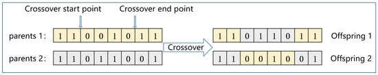 - Crossover operationThe population was divided into two sub-populations, one with a fixed crossover probability and the other with an adaptive crossover probability. The adaptive crossover probability is calculated as follows:where and denote the larger and smaller crossover probabilities, K represents the current iteration number, and represents the maximum number of iterations. The crossover mechanism employed here is a two-point crossover method, which randomly sets the starting point and end point of the crossover in the chromosome string, exchanges the structure between the parents’ exchange points, and generates two new individuals, as illustrated in Figure 5.