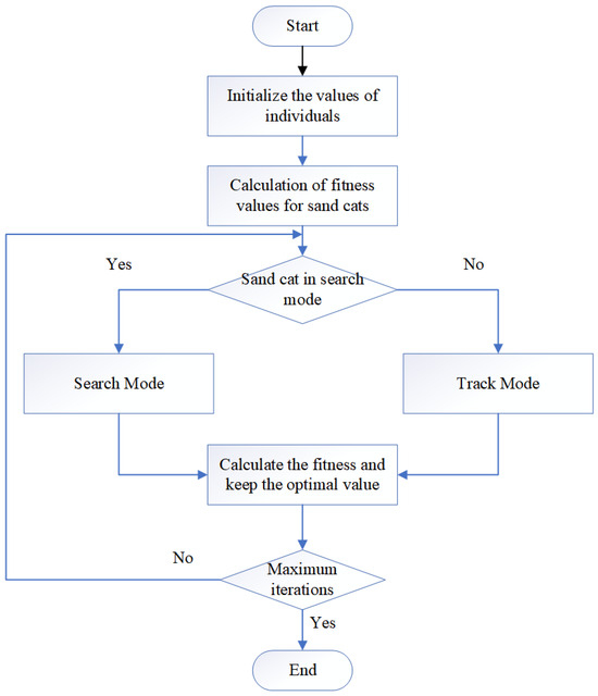The Sand Cat Swarm Optimization (SCSO) algorithm mimics two primary survival behaviors observed in natural sand cat populations: foraging and hunting prey [30,31]. Compared to other population-based intelligence algorithms, the Sand Cat Swarm Optimization (SCSO) algorithm demonstrates robust optimization capabilities, making it well-suited for addressing complex multi-objective optimization problems. However, its convergence speed and search accuracy are moderate, which increases its susceptibility to becoming trapped in local optima. Thus, this paper introduces three enhancement techniques to strengthen the global search capabilities of the Sand Cat Swarm Optimization algorithm. The Improved Sand Cat Swarm Optimization (ISCSO) algorithm is subsequently applied to solve the edge node deployment problem in mobile device scenarios. The detailed steps of the ISCSO algorithm are presented in Algorithm 2. Figure 6 shows the flowchart of the ISCSO.