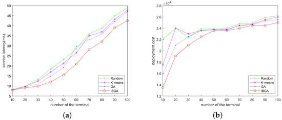 Figure 11b illustrates the deployment costs of various methods as the number of terminal devices increases. The figure reveals an upward trend in deployment costs for all four methods as the number of devices increases. Among the four algorithms, IBGA consistently demonstrates superior performance and lower costs. The randomized algorithm displays significant cost fluctuations due to its unrestricted nature. This is attributed to the growing number of devices, resulting in increased task volume and higher demand for computing resources. Consequently, more expensive nodes are selected to meet the higher resource requirements, resulting in escalated deployment costs.
