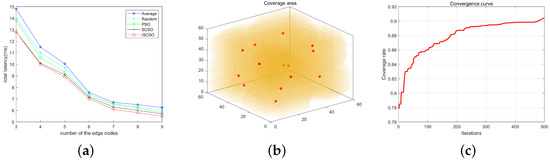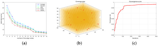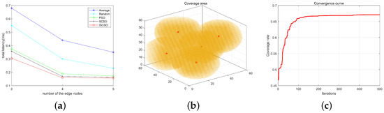 Figure 12 illustrates the relationship between task completion delay and the number of nodes, with the number of cars set at 5. As shown in Figure 12a, the overall task delay decreases as the number of nodes increases. As the number of edge nodes increases, additional computational resources are provided, leading to a higher number of tasks being processed. Consequently, the overall delay decreases with the increase in the number of nodes. After analysis and comparison, the ISCSO algorithm demonstrates a delay reduction of up to 45%, outperforming the other four algorithms in minimizing delay. This improvement is attributed to the proposed algorithm’s consideration of device mobility and the correlation between tasks and locations, which leads to a more effective node matching model. Furthermore, the enhanced spiral search and Lévy flight strategies in the ISCSO algorithm expand the exploration space, enhance the algorithm’s global search capability, and facilitate the identification of the optimal solution in a shorter time. Figure 12b represents the deployment positions and coverage ranges of the nodes. Figure 12c shows that as the number of iterations increases, the device coverage stabilizes at 67%, and the algorithm converges after 200 iterations.