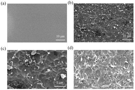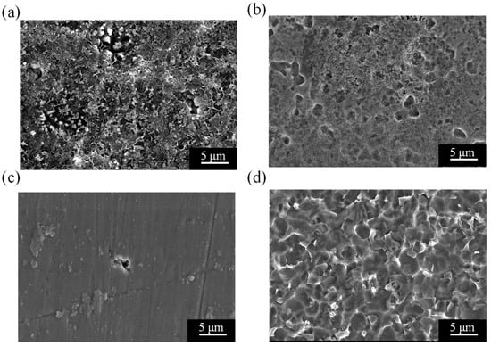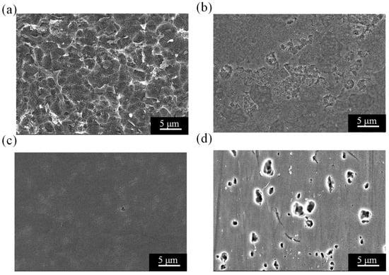 Considering the advantages of electrochemical corrosion in surface modification, this study chose this method to investigate the effects of different electrolytes on Ti-64 surface morphology. Figure 7 shows SEM images of surfaces after electrochemical corrosion in four different electrolytes. Electrochemical corrosion in a 0.5 M HF electrolyte (Figure 7a) produced a highly porous surface structure with an irregular honeycomb-like morphology. Pore sizes ranged from the submicron to the micron scale. This structure likely originates from the selective dissolution of the TiO2 protective layer by F− ions, forming [TiF6]2− complexes [75]. Such a porous structure is expected to increase surface area, potentially enhancing cell adhesion capability and osseointegration. In contrast, treatment with a 0.5 M H2SO4 electrolyte (Figure 7b) resulted in a relatively smooth surface with only minor shallow pits and fine indentations. This morphology may be due to the uniform corrosion action of sulfate ions on the titanium surface, albeit with relatively weak corrosive power. While this surface may contribute to improved corrosion resistance, it might not be as conducive to cell adhesion as the HF treatment. The 0.5 M NaF electrolyte treatment (Figure 7c) showed almost no significant morphological changes, presenting a highly uniform and smooth surface. This may be due to the formation of a stable fluoride film during the electrolysis process, preventing further corrosion [75]. Although this surface may exhibit good corrosion resistance, it might not be favorable for cell adhesion and growth. Treatment with a 0.5 M HNO3 electrolyte (Figure 7d) produced a unique surface morphology characterized by scattered circular pores. These pores varied in size, with diameters ranging from approximately 0.5 to 2 μm. This structure may result from the strong oxidizing action of nitrate ions, leading to localized rapid dissolution. Such surface morphology might provide cell attachment sites while maintaining a certain degree of surface integrity.