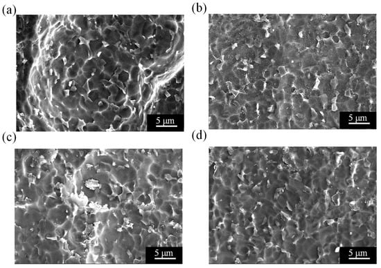 Figure 3 illustrates the surface morphology of the Ti-64 alloy subjected to a two-step surface modification process, sandblasting at a 45° angle using zirconia sand of different grit sizes (80 and 120 grit), followed by low-temperature (5 °C) immersion corrosion in HF solutions of varying concentrations (3M and 12M). This composite treatment aims to create bioactive surfaces with multi-scale structural features. Comparing Figure 3a,b, we observe the significant influence of HF concentration on surfaces initially treated with 80-grit sand. The 3 M HF treatment (Figure 3a) produced relatively uniform etch pit structures, resulting in micron-scale surface features that may promote cell adhesion. In contrast, the 12 M HF treatment (Figure 3b) led to more aggressive corrosion, forming deeper and wider etch pits with superimposed nano-scale secondary structures. This multi-level surface architecture may be more conducive to the osseointegration process [66,68]. A comparison of Figure 3c,d reveals the effects of different HF concentrations on surfaces initially treated with 120-grit sand. The 3 M HF treatment (Figure 3c) preserved more of the original sandblasted texture while forming uniformly distributed micro-pits on the surface. The 12 M HF treatment (Figure 3d) resulted in more pronounced surface reconstruction, creating a more complex three-dimensional network structure. This structure may provide a larger specific surface area and more cell attachment sites [52,55,56]. Comparing all four treatment methods, we observe that surfaces initially treated with 80-grit sand exhibited greater changes during subsequent corrosion. This may be attributed to the higher initial surface roughness, which provided more active sites for corrosion. The 12 M HF treatment generally led to more dramatic surface reconstruction, forming more complex multi-scale structures.