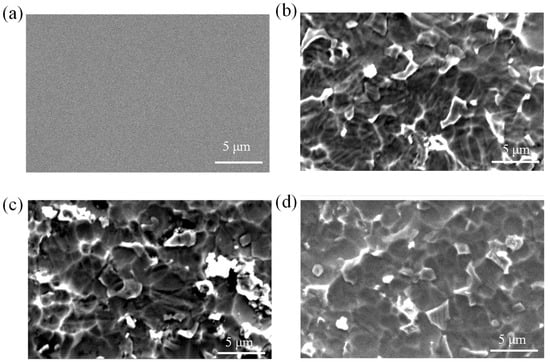 Surface morphology was examined using a JSM 5600 (Tokyo, Japan) scanning electron microscope (SEM). SEM operates on the principle of secondary electron emission, where weakly bonded (<50 eV) electrons are emitted by sample atoms when bombarded by accelerated electrons. Secondary electrons generated at a depth of approximately 50–500 Å from the sample surface are detected to form the image. Raman spectroscopy was conducted using a Renishaw InVia Raman Microscope (Renishaw Taiwan Inc., Taichung, Taiwan). A 532 nm He-Ne laser, with a scanning range of 200–2000 cm−1 and a constant power output of 10 mW, was used as the light source. Raman spectroscopy provides valuable information regarding crystalline properties and atomic bonding through the analysis of vibrational spectra. Surface roughness was evaluated using a Veeco Dektak profiler. The scanning length was set to 1000 μm with a scanning rate of 100 μm/s. Three random locations were measured on each sample to obtain average Ra (arithmetic average roughness) and Rq (root mean square roughness) values. Surface hardness was measured using a Wilson/Rockwell Series 500 (Wilson Instruments, Norwood, MA, USA) hardness tester with the HR15N scale. Three random points were tested on each sample surface to obtain an average value.