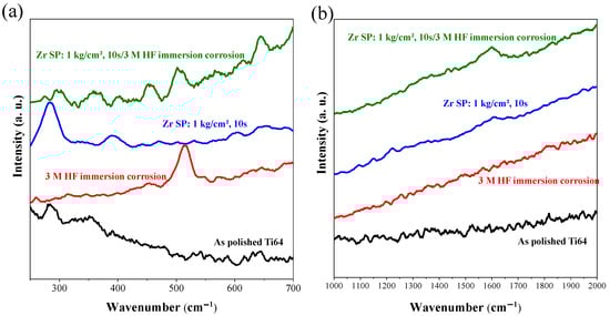 Raman spectra of Ti-6Al-4V surfaces at (a) short wavenumber range (250–700 cm−1) and (b) longer wavenumber range (1000–2000 cm−1) under various treatment conditions.