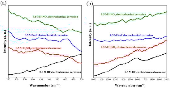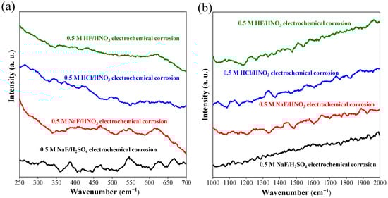 Figure 8 presents the Raman spectra of the Ti-64 alloy after electrochemical corrosion in four different electrolytes (0.5 M HNO3, 0.5 M NaF, 0.5 M H2SO4, and 0.5 M HF). These spectra cover two critical wavenumber ranges, namely, 250–700 cm−1 and 1000–2000 cm−1, providing information for understanding the structural characteristics and evolution of the surface oxide layer. In the low wavenumber range (250–700 cm−1), the spectral features primarily reflect the crystalline structure of TiO2. Samples treated with different electrolytes exhibit distinct spectral characteristics, suggesting diversity in the surface oxide layer structures. Notably, samples treated with HNO3 and NaF show characteristic peaks at approximately 450 cm−1 and 610 cm−1, respectively. These peaks can be attributed to the Eg mode of anatase and the A1g mode of rutile TiO2 phases [73]. In contrast, samples treated with H2SO4 and HF lack distinct crystalline phase peaks in this range, indicating the possible formation of amorphous or highly defective oxide layers. The spectral features in the high wavenumber range (1000–2000 cm−1) provide information about surface defects and second-order scattering processes. All samples exhibit broad features in this range, but with varying intensities and shapes. These differences reflect the impact of different electrolyte treatments on the surface microstructure and chemical composition. Notably, the HNO3− treated sample shows the strongest spectral response between 1300 and 1600 cm−1, which may be related to oxygen vacancies in non-stoichiometric TiO2, suggesting a complex surface defect structure. Comprehensive analysis indicates that the choice of electrolyte significantly influences the structure and composition of the oxide layer on the Ti-64 surface. The HNO3 treatment appears to induce the most pronounced surface oxidation, potentially forming a mixed structure of anatase and amorphous TiO2. The NaF treatment tends to promote the formation of the rutile phase, which may affect surface stability and biocompatibility. The H2SO4 and HF treatments likely result in more disordered or amorphous surface structures, which may have advantages in certain biological applications, such as enhanced protein adsorption capability.