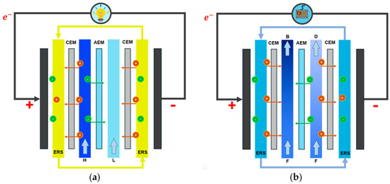 RED and ED reactors are electrochemical flow reactors consisting of several internal compartments separated by alternating anion exchange membranes (AEMs) and cation exchange membranes (CEMs). At the ends of the cell, they feature an electrode system that includes an electrode rinse solution (ERS). However, while the RED reactor is a galvanic system that generates energy by harnessing the spontaneous movement of ions down their concentration gradient, the ED system requires an external energy source to drive the desalination process by forcing ions to migrate against the chemical potential. Figure 1a illustrates a RED unit cell, where a high-concentration saline solution (H) and a low-concentration solution (L) are separated by IEMs, creating a chemical potential difference. This gradient drives the diffusion of anions (Cl−) through AEMs and cations (Na⁺) through CEMs, generating an ionic current. Electrodes at the ends of the cell convert this ionic current into electrical energy through redox reactions. Figure 1b shows an ED reactor. In this case, a saline feed solution (F) flows through the compartments, and an external power source polarizes the electrodes. The electric field causes anions and cations to migrate toward the anode and cathode, respectively. The selective membranes reduce the salt concentration in one compartment, producing desalinated water (D), while the adjacent compartment accumulates the removed salts, resulting in a brine solution (B).