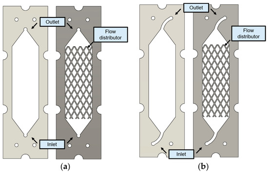 Based on the studied geometries for the ED and RED reactors, the components of the devices were designed, including gaskets, flow distributors (FDs), end plates, and compression plates. The arrangement of the gaskets and FDs forms the compartments for the saline solutions and electrode rinse solutions. The gaskets primarily function as seals to prevent external leaks and cross-contamination. Material choice for the gaskets is crucial, as it impacts the reliability of the seal and fluid distribution. For optimal performance, materials with an appropriate Shore hardness are selected to ensure flexibility and resilience; a material that is too rigid may not seal properly, whereas a material that is overly soft or thin could deform or tear under pressure, compromising the seal. Therefore, choosing an adequate Shore hardness is essential to balance flexibility and strength according to the specific requirements of the gasket component. The FD, designed to ensure uniform fluid distribution within the compartments, is constructed to provide structural stability while minimizing stagnation zones. The material for the FD must withstand constant fluid flow without excessive deformation, which could impede fluid distribution and lead to pressure imbalances within the reactor.