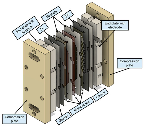 For the manufacturing of the reactor components, the CAD design was converted into a coordinate file format for the printer, known as Standard Triangle Language (.STL). For the end plates and FD, the material must have high mechanical strength, as the parts will be subjected to compression and high chemical resistance to withstand varying pH levels. The end plates and FD were produced using the Fortus® 450mc 3D production system (Stratasys Ltd., Edina, MN, USA). Acrylonitrile Styrene Acrylate (ASA), an engineering plastic (Stratasys Ltd.), was selected for its high mechanical strength and chemical resistance. The ASA material is designed to withstand substantial pressures, with a compression limit of 75.4 MPa in the XZ orientation and 188 MPa in the ZX orientation, according to the manufacturer’s specifications. Assembly of the reactors is performed using a torque of 6 Nm to ensure a secure fit without over-compressing the components. Excessive compression is not recommended, as it may lead to the deformation of internal parts, rupture of membranes, or even constriction of the channels supplying the reactor. Although the material can tolerate significant pressure, maintaining a controlled pressure level is essential to preserve the integrity and functionality of the reactor structure, thus avoiding potential issues associated with high-pressure desalination processes.