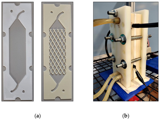 The printing process was configured using an Insight slicer, which converts STL files into CMB files (a format containing the print path and settings for 3D printers). Both the end plates and FD were printed solid (100% infill) to prevent electrolyte permeation, using a nozzle with a layer height of 0.1778 mm for high-dimensional precision. For the gaskets, a flexible yet durable material is required. Thermoplastic polyurethane (TPU) is a good choice for printing gaskets due to its combination of elasticity, abrasion resistance, and chemical durability. Various TPU formulations are determined by their Shore hardness, which affects the material’s rigidity and flexibility. In 3D printing, a lower Shore hardness indicates more flexibility, while a higher Shore hardness results in greater rigidity. TPU 95A was selected, and 1 mm thick gaskets were printed using an Ultimaker 2 Extended+ printer (Ultimaker, Utrecht, The Netherlands). The process was configured in a Cura slicer, utilizing a nozzle with a 0.6 mm layer height. The fabrication of two reactors (RED and ED) took a total of 20 h and 50 min, using a material volume of 606.97 cm3. The total printing cost for both reactors, including the FD, gaskets, and end plates, was $232.46. Figure 4 shows the 3D-printed components used in the reactor assembly. In Figure 4a, a gasket printed in TPU 95A and an FD printed in ASA are displayed; Figure 4b shows the reactor assembled.