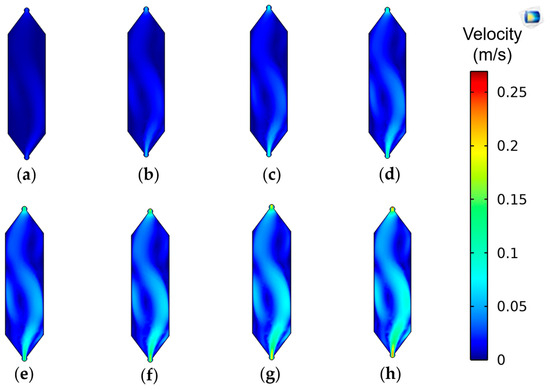 Velocity profile simulations of geometry 2 at different initial flow rates: (a) 10 mL/min, (b) 20 mL/min, (c) 30 mL/min, (d) 40 mL/min, (e) 50 mL/min, (f) 60 mL/min, (g) 70 mL/min, and (h) 80 mL/min.