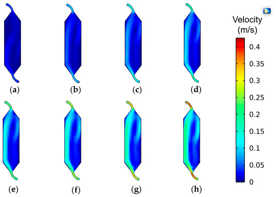 Figure 6 presents the velocity profile simulations for the second geometry (geometry 2) at several initial flow rates. This geometry has distinctive curved inlets and outlets, specifically designed to provide greater fluid inlet flexibility. The flow appears relatively uniform at a low flow rate of 10 mL/min (Figure 6a), with the highest velocities concentrated near the curved inlets and outlets. As the flow rate increases (Figure 6b–h), the uniformity of the flow is reduced. Starting from 20 mL/min (Figure 6b) and 30 mL/min (Figure 6c), higher velocity zones begin to form near the inlets and outlets, while slower regions develop in the reactor’s center. This pattern intensifies at higher flow rates, as seen in Figure 6d–h, where irregular flow patterns emerge. In all cases, the highest velocities are observed at the inlets and outlets, as expected from the design. However, as flow rates increase, the flow distribution becomes less uniform, potentially impacting mass and charge transfer within the reactor.