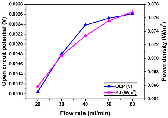 Effect of flow rate on open-circuit potential and power density in RED characterization.