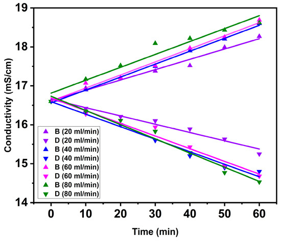 Higher flow rates improve desalination efficiency by reducing concentration polarization near the membrane surfaces, thereby enhancing ion transport across the compartments. Studies, including those by [34,35], demonstrate that increased flow rates decrease the thickness of the boundary layer, reducing resistance to ion migration and preventing ion buildup that otherwise hinders desalination. This effect allows for more efficient desalination, especially at higher initial salt concentrations. Desalination experiments were conducted over 60 min, with electrical conductivity measurements taken every 10 min to monitor the progression of salinity changes in both the desalinated and brine compartments. The initial conductivity in all reservoirs was set at 16.6 mS/cm. The results are illustrated in Figure 8, which depicts the variation in conductivity observed during the experiments conducted at different flow rates, ranging from 20 to 80 mL/min. The desalinated water compartment showed a consistent decline in conductivity over time, while the brine compartment experienced a corresponding increase. These trends demonstrate the direct impact of flow rate on the efficiency of ion transport between compartments.