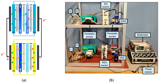 Schematic and experimental setup of the hybrid RED-ED system: (a) schematic diagram of the hybrid system, showing the RED and ED reactors connected electrically but operating with independent solutions; (b) photograph of the experimental setup, illustrating the RED and ED reactors connected, peristaltic pumps, multimeter, and the power resistor.