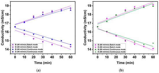 Conductivity variation during ED desalination powered by RED under different operational modes: (a) conductivity behavior with ED operated at 40 mL/min under batch and continuous modes for the RED reactor; (b) conductivity response with ED operated at 80 mL/min under both batch and continuous RED modes.