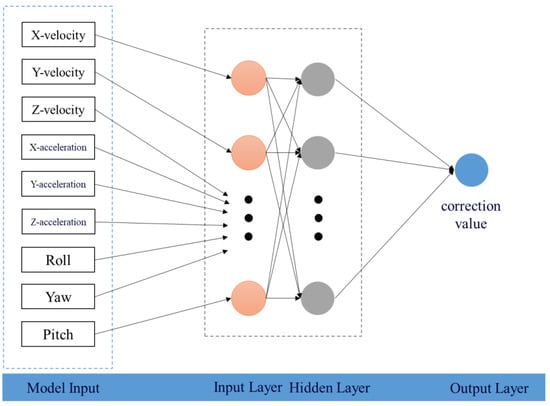 The core structure of this system consists of input, hidden, and output layers (as illustrated in Figure 3). In this study, the correction model specifically considers nine input factors: roll angle, yaw angle, and pitch angle, as well as velocities and accelerations in the x, y, and z directions. The output layer is responsible for providing corrected values of various air quality indices, which will be used for the dynamic correction of measured values.