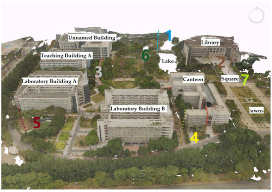 The Science and Technology Teaching Area of Guangzhou University (23.11667° N, 113.25000° E) was chosen as the measurement site for this study. As shown in Figure 4, the layout of the teaching area is as follows: