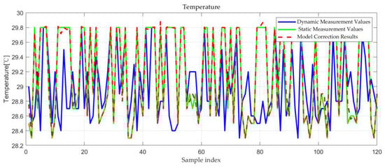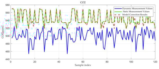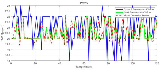 Table 4 summarizes the loss function of the BP neural network model, and Figure 5 illustrates the relationship between dynamic measurement values of the UAV and the model-corrected values with static measurement values. According to Table 4, the mean squared errors of the BP neural network models for the four air quality indices are all less than 0.1, and the coefficient of determination R2 exceeds 90%. From Figure 5, Figure 6, Figure 7 and Figure 8, it is evident that there is a significant deviation between the model-corrected values and the dynamic measurement values, whereas they align closely with the static measurement values overall. These results indicate that the BP neural network model performs well in terms of fitting, accurately capturing patterns within the data. In these figures (Figure 5, Figure 6, Figure 7 and Figure 8), the green line represents the static measurement values, which are the control group data measured by the sensors in an ideal stationary state. The blue line represents the dynamic measurement values, which are the data measured by the sensors mounted on the UAV during flight in the same series of positions. The red dashed line represents the model correction results, which is the sum of the dynamic measurement values and the corrected values predicted by the neural network model.