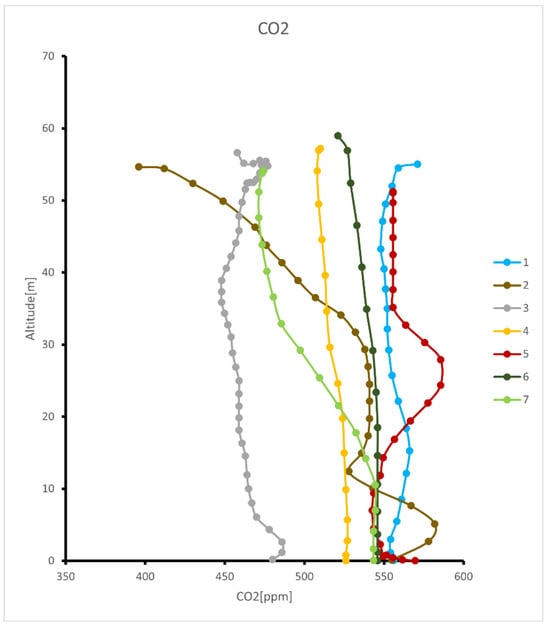 As shown in Figure 9, the CO2 concentration is lowest at Point 3 and highest at Point 5. With increasing altitude, significant reductions in CO2 concentration are observed at Point 2 in the square area and Point 7 in the lawn area. The decrease in CO2 concentration at Point 2 is particularly steep, surpassing the previously lowest concentration at Point 3 at an altitude of approximately 50 m, becoming the new low point. This reflects the promoting effect of open areas on the vertical dispersion of CO2.