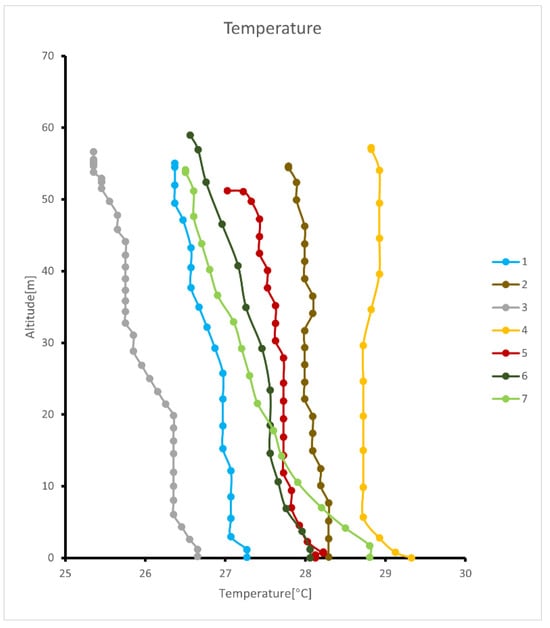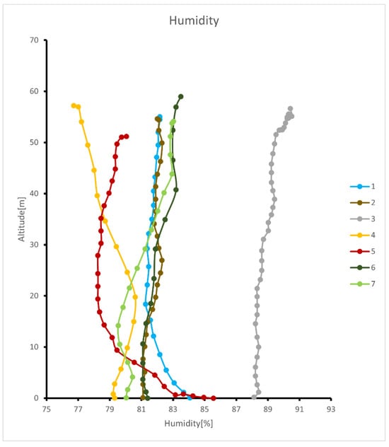 As shown in Figure 10, with increasing altitude, the temperature at various points exhibits a decreasing trend, which aligns with the common atmospheric phenomenon known as the lapse rate [26]. It can be observed that the temperature at Point 3 consistently remains lower than at other locations, while Point 4 consistently shows the highest temperature levels. This is in direct contrast to the humidity trends shown in Figure 11, where the humidity at Point 3 is significantly higher than at other points, and Point 4 has the lowest humidity. Except for Points 4 and 5, the humidity at the other locations increases with altitude. This is because lower temperatures at higher altitudes reduce the air’s capacity to hold water vapor, thereby increasing relative humidity [27,28].