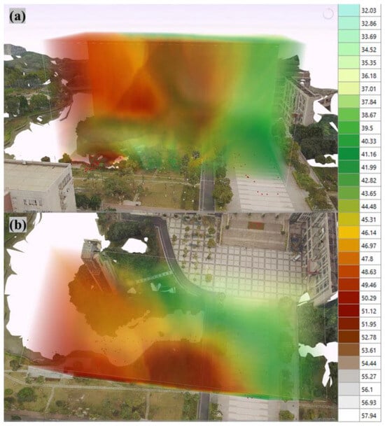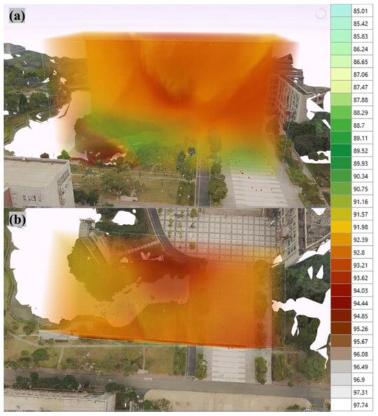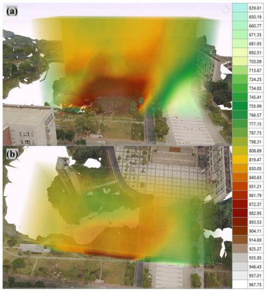 Moreover, the three-dimensional distribution models generated through our UAV platform indicate that air quality dynamics at the microenvironment scale are intricately linked to geographic and structural features. For example, the correlation between high humidity and elevated PM2.5 concentrations in areas with extensive electronic equipment underscores the necessity for targeted monitoring strategies in urban planning and public health initiatives [33,34]. Maintaining a safe distance between these pollution sources and residential or workplace environments is essential to mitigate air quality degradation and its associated health impacts.