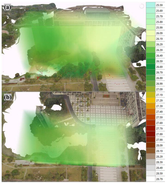 Figure 14 depicts the temperature distribution. Temperatures are relatively higher above water bodies and vegetation, while they are lower above the plaza area. This pattern may be attributed to the higher thermal capacity of water bodies and vegetation, allowing them to store and slowly release heat. Additionally, although water evaporation typically lowers ambient temperatures, high humidity slows down the evaporation rate, thereby weakening this cooling effect.