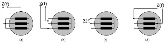 Several types of impedance measurements can be performed on a permanent magnet synchronous machine (PMSM). The most common types in the literature are common-mode (CM) and differential-mode (DM) measurements. On an electrical machine with a star-connected winding, these CM and DM measurements are carried out by connecting the different phases of the machine, as shown in Figure 1a,b. For condition monitoring purposes and to locate the fault in the windings, it is possible to successively analyze the behavior of two of the machine phases, as shown in Figure 1c. Finally, with access to the neutral point, it is possible to characterize the behavior of each phase individually, as described in Figure 1d.