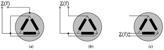 Similarly, for machines with delta-connected windings, the CM and DM impedance behaviors are measured by connecting the machine phases as shown in Figure 2a,b. Figure 2c describes the connection scheme for characterizing the impedance behavior of each of the machine phases.