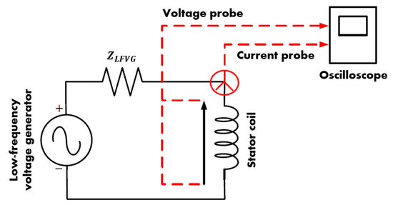 Another approach to offline characterization of stator windings requires an oscilloscope to measure the amplitudes of the voltage across a winding and the current flowing through it, as well as the temporal phase shift between these two signals. Then, by applying Ohm law, we can calculate the amplitude and the phase of the winding impedance at a given frequency [17]. The winding must be connected to a low-frequency voltage generator (LFVG), which provides a sweep of frequencies from 1 kHz to 30 MHz to extract the Bode diagram of this impedance. The connection and measurement scheme of this method are shown in Figure 4. This approach can therefore be implemented using fairly common electrical engineering equipment. However, it is a time-consuming process that is difficult to automate and requires numerous measurement points, especially for frequencies above megahertz, to ensure the same accuracy as the results obtained with the impedance analyzer. Moreover, the accuracy of the characterization around certain resonances may be limited by the current amplitude that the LFVG can deliver.