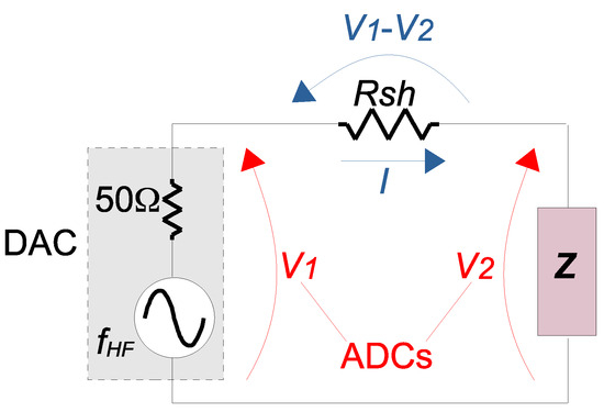 where Z is the impedance amplitude of the system to be characterized, and are the voltage amplitudes measured at the HF generator and machine terminals respectively and is the shunt resistor used to determined the amplitude of the current I.