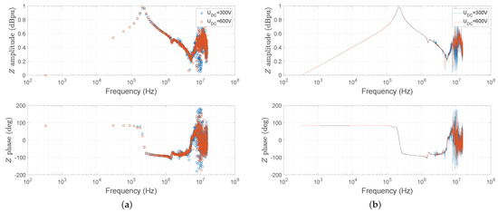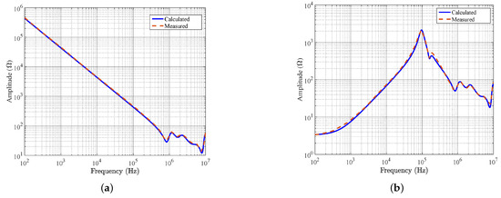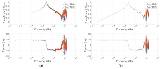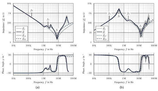 Comparison of experimental and modeled CM (a) and DM (b) impedance frequency behavior—taken from [45].
