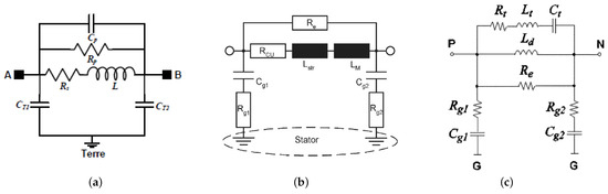 The model complexity is determined by the purpose of the modeling and the accuracy required. The first approaches identified in the literature are based on modeling of each machine phase, similar to what is used to describe the behavior of transmission lines [49]. For example, we can identify the HF EEC models developed in [34,43,50] and presented in Figure 7.