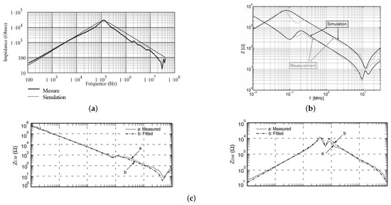 Experimental and modeled impedance frequency response of three parallel phases in [50] (a), of CM and DM in [34] (b), and of CM and DM in [43] (c).