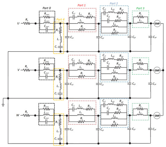 Figure 9 shows the complete HF EEC model developed in [45] to characterize the impedant frequency behavior of an 8 kW, star-connected PMSM. Note the following in this model: