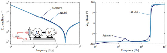 Ref. [24] explains that the impedance characteristics of mechatronic systems are largely impacted by parasitic effects such as inductive loops, capacitive couplings, or dissipative phenomena. Consequently, it is difficult to accurately predict and model this behavior during the design phase of these systems because there are too many manufacturing uncertainties. Therefore, most studies are based on actual measurements of the impedance behavior and attempt to capture and represent it in a simplified manner.