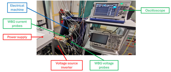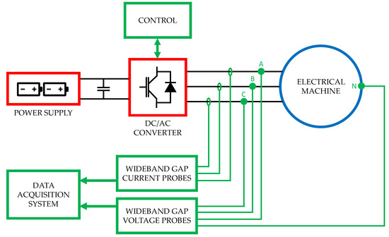 The system under investigation is described in Figure 13. The electrical machine is powered by a voltage source inverter (VSI), made of SiC power components, and driven by pulse–width modulation (PWM). The only variables required for frequency impedance characterization are the voltages at machine terminals and the currents circulating in the windings. As mentioned above, these signals are evaluated using wideband gap probes and processed to calculate the frequency response of the windings. Finally, the resistance value of each machine phase is also required to implement the proposed method.