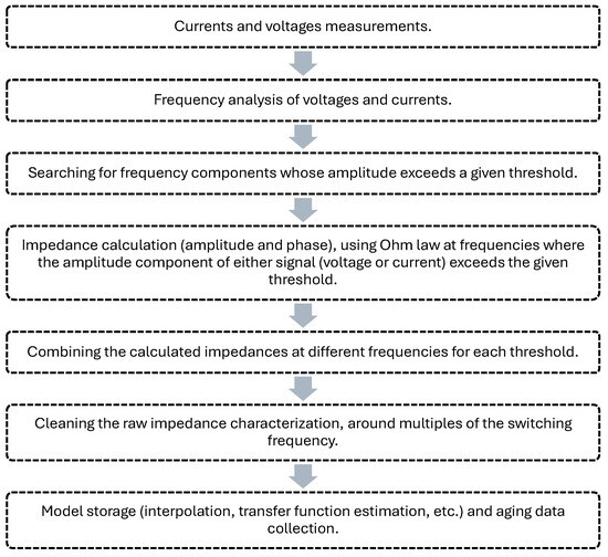 The proposed method consists of several steps. First, a frequency analysis of the signals is performed. Then we look for frequency components whose amplitude is above a defined threshold. Then, using these data, we apply Ohm law to calculate the impedance amplitude and phase for each highlighted frequency. To reduce noise and uncertainties around multiples of the switching frequency, we must refine the raw characterization. Finally, modeling or interpolation is performed to store this impedance behavior and thus gather useful information for aging monitoring (frequencies and amplitudes of the first parallel and series resonances).