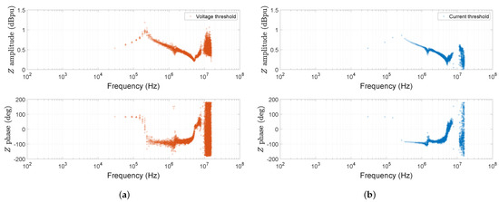 We have also studied the influence of the inverter switching frequency on the accuracy of the proposed impedance identification method. Since it is the various multiples of the switching frequency that are intrinsically excited, this means that for a fixed measurement frequency range, the characteristic obtained is enriched or depleted, depending on the switching frequency used. This assertion is confirmed by comparing the cleaned impedance characteristics shown in Figure 27a, obtained with kHz and kHz. The number of blue points is twice as high when the switching frequency is set to 15 kHz.