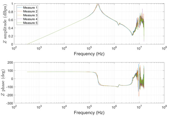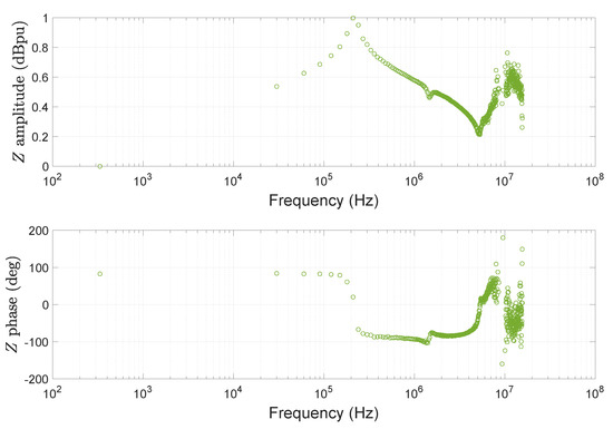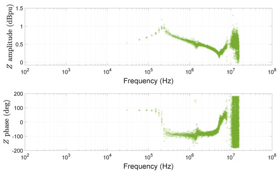 The impedant behavior is generally displayed as a Bode diagram over a wide frequency range (from hundreds of hertz to several tens of megahertz), as shown in the example in Figure 6 taken from [25]. In this example, the low-frequency behavior of CM is purely capacitive, while that of DM is mostly inductive. Moreover, at higher frequencies, there are numerous resonant frequencies that represent the wealth of the information provided by this characteristic.