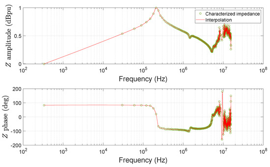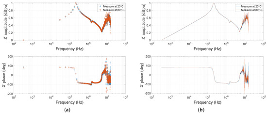To investigate the effect of temperature on the HF impedance frequency response of the machine, we carried out two characterizations at different temperatures. The first at room temperature (T = 25 °C), after a few moments of operation, and the second after a few tens of minutes of circulating a current in the windings, so that the thermal regime is established. The second test was performed at a temperature of 80 °C. The results are shown in Figure 26. From the characterization plot after cleaning, as well as its interpolation, we can see that the HF impedance behavior remains identical, regardless of the operating temperature.