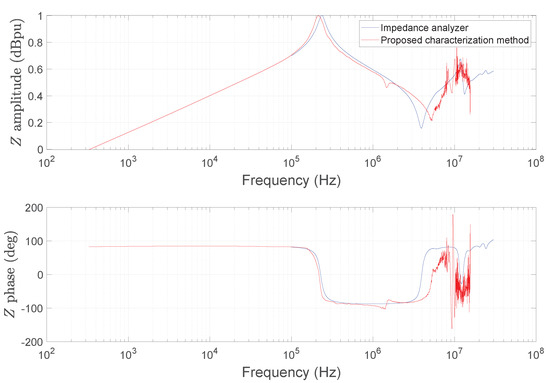 Comparison of impedance characterizations obtained with the proposed online method and with an impedance analyzer.