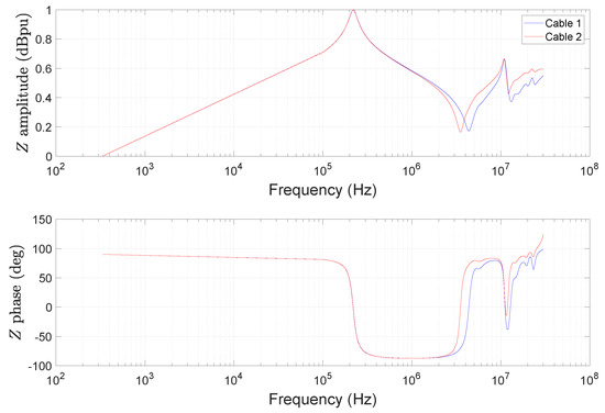 There is a strong correlation between the two frequency behaviors. The relative difference between the two characteristic frequencies of the first parallel resonance is less than 10%. In terms of amplitude, the two approaches give the same result. On the other hand, there is a deviation between the behavior observed with our online method and with the impedance analyzer around the first series resonance. This is intrinsically related to the use of fixture adapters and a measurement cable between the impedance analyzer and the test machine, as explained in [58] and confirmed by Figure 25, which compares the impedance response of a traction machine as a function of the cable used. Based on these results, it is essential to emphasize the importance of using the same measurement conditions if we want to properly exploit the results of these frequency analyses and draw the correct conclusions about the health of the windings.