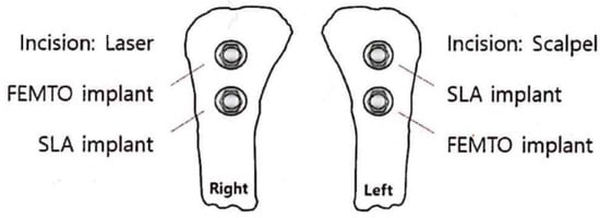In the present study, the suitability of laser use for soft-tissue incision for implant placement and the in vivo stability of the femtosecond laser-treated implant were evaluated by applying two types of implants to the tibias of New Zealand White rabbits. A conventional method using a scalpel was selected as a control for laser incision, and an SLA implant was used as a control for the femtosecond laser-treated implant. Healing of the incision site was monitored for 2 weeks, and radiologic and histologic evaluations of the implants were conducted at 4 and 6 weeks post-implantation.