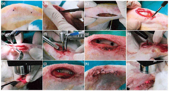Surgical process: (a) surgical preparation; (b) incision with a scalpel; (c) incision with laser; (d–g) implant placement; (h) measurement of the implant stability quotient; (i) photography; (j) cover screw fastening; (k) suture; (l) photography.