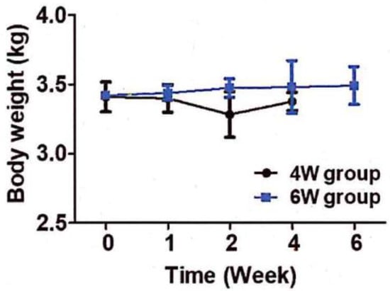 A neck collar was applied after surgery to protect the surgical area. The experiment was completed without any unusual symptoms in all animals. The average bodyweight before surgery was 3.41 ± 0.11 kg in the ‘4-week group’ and 3.42 ± 0.06 kg in the ‘6-week group’. In the second week after surgery, bodyweight in the ‘4-week group’ averaged 3.28 ± 0.16 kg, a decrease of approximately 3.81% compared to before surgery, but gradually recovered thereafter. The average bodyweight in the ‘6-week group’ at Week 6 was 3.49 ± 0.14 kg, which was almost the same as before the application (Figure 3).