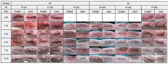 During surgery, the area incised with the laser was immediately followed by a hemostasis process, making it easier to secure visibility. On the day of surgery, a relatively large amount of bleeding occurred at the laser incision site, and on the day after surgery, a black color change was observed in the surrounding tissue that had suffered heat damage from the laser. On Day 7, most of the incision sites showed complete healing, but on Day 14, in one animal, the laser incision area became necrotic, and the internal tissue was exposed (Figure 4).