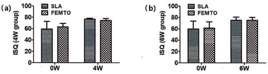 ISQ values: (a) 4-week group; (b) 6-week group. Data shown are mean ± standard deviation, two-way analysis of variance. FEMTO, femtosecond laser; ISQ, implant stability quotient; SLA, sandblasted, large-grit, acid-etched; W, week.