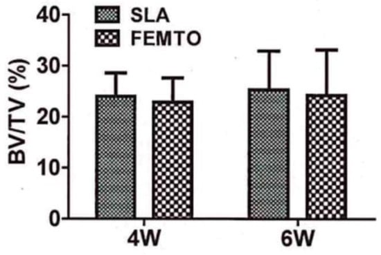 Micro-CT quantitative analysis. BV, bone volume; TV, tissue volume; FEMTO, femtosecond laser; SLA, sandblasted, large-grit, acid-etched; W, week.